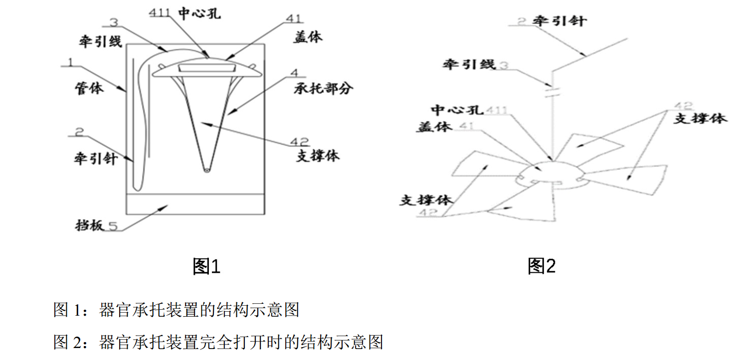 上海第二军医大学附属长海医院的多位经验丰富的外科专家,根据实际临床需求, 精心设计出了一种承托稳固、能有效暴露手术视野、无附加损伤的器官承托装置。该装置整体设计成管体,承托体放置在管体内部。手术时,经操作孔将管体送至待承托器官处, 将承托体从管体取出,支撑体打开形成扇面结构以支撑器官。牵引线从脏器安全区穿过,腹壁外打结固定。手术后,使支撑体恢复至收拢状态,将其从体内取出。此外,本发明圆弧状盖体的设计,使得装置与器官的接触面比较柔和,同时压迫脏器穿针处起到止血的功能。